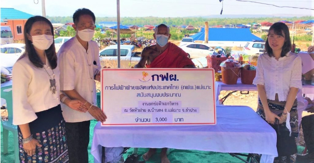 เมื่อวันที่ 4 พฤษภาคม 2566 นางเกษศิรินทร์ แปงเสน หัวหน้าโครงการแม่เมาะเมืองน่าอยู่ พร้อมด้วยผู้บริหารและผู้ปฏิบัติงาน กฟผ.แม่เมาะ เป็นผู้แทน กฟผ.แม่เมาะ ร่วมงานยกช่อฟ้าเอกวิหารวัดหัวฝาย และสนับสนุนงบประมาณจำนวน 3,000 บาท เพื่อร่วมสืบสานประเพณีวัฒนธรรมชุมชน ตลอดจนสร้างความสัมพันธ์อันดีกับชุมชน โดยมี นายพนมพร ตุ้ยกาศ นายอำเภอแม่เมาะ เป็นประธาน และผู้นำชุมชน ประชาชนในพื้นที่เข้าร่วมงาน ณ วัดหัวฝาย หมู่บ้านอพยพ ต.บ้านดง